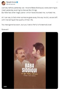 अरोरा यांनी एक हृदयस्पर्शी व्हिडिओ क्लिप देखील शेअर केली आहे ज्यामध्ये ते आणि बाबा सिद्दीकी निवडणुकीची रणनीती आणि राष्ट्रवादीच्या भविष्यातील योजनांबद्दल चर्चा करताना दिसत आहेत.